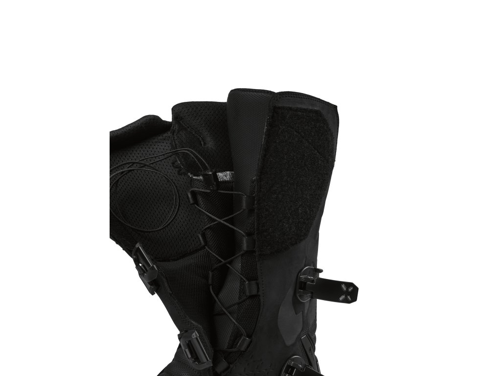 🛡️ Stabilita a bezpečnost: Unikátní kombinace vnitřního šněrovacího systému a dvou robustních vnějších spon zajišťuje precizní fixaci nohy při zachování potřebné pohyblivosti pro ovládání stroje.