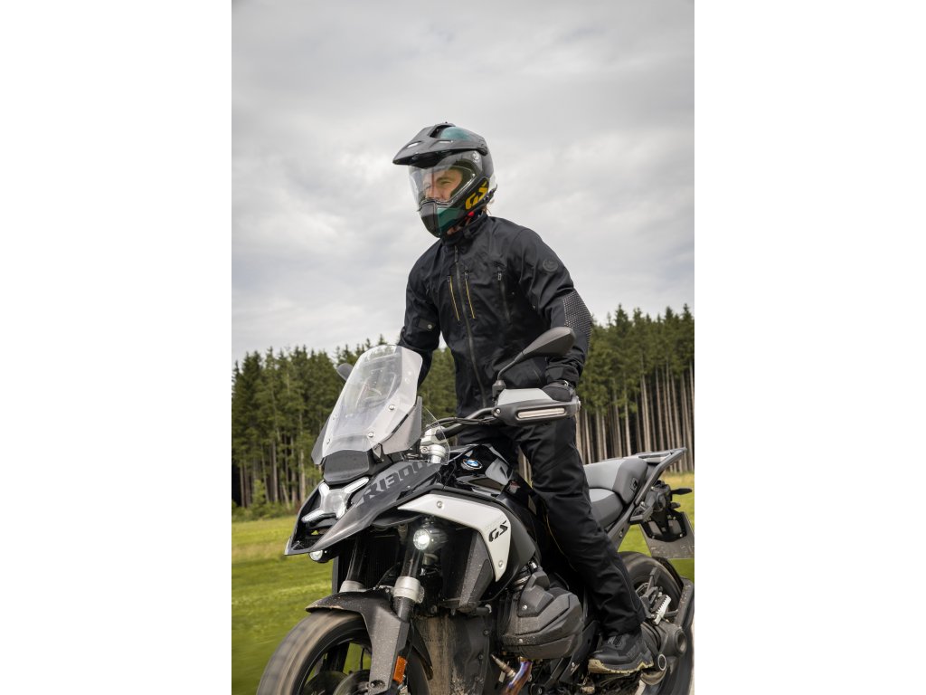 Textilně-kožené kalhoty sportovního střihu s Gore-Texovou pláštěnkou ve stejném vzhledu.