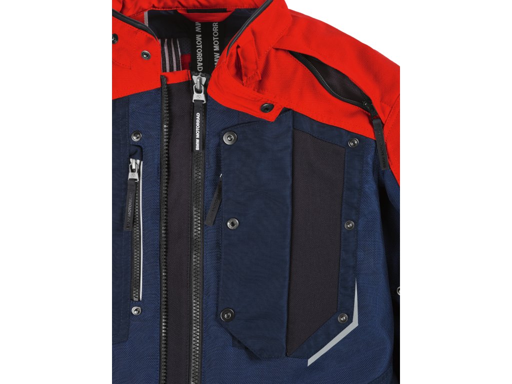 Profesionální enduro kalhoty BMW GS Rallye GORE-TEX v modro-červené barvě. Výškově nastavitelné chrániče NP3 Evo, kožené výstelky pro lepší grip a vnější GORE-TEX vrstva.