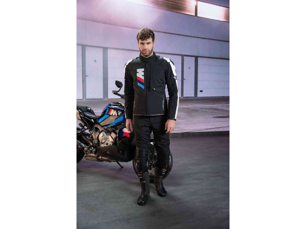 Textilne-kožené nohavice športového strihu súčasťou ktorých je Gore-Texová pláštenka v rovnakom vzhľade.